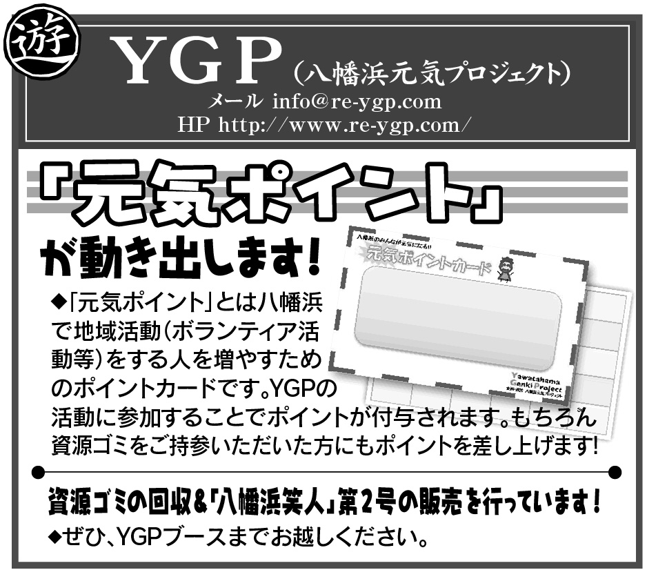 YGPでは「元気ポイント」のPR活動、八幡浜笑人の販売、資源ゴミの回収を行います。